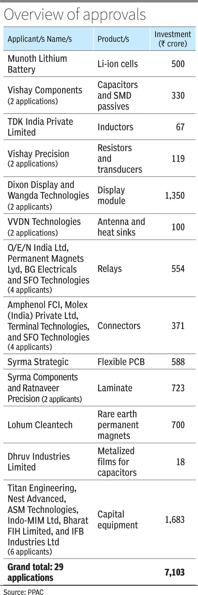 Meanwhile, MeitY on Monday approved 29 applications under the ECMS, entailing a cumulative investment of ₹7,103 crore and 14,246 jobs. These new applications will lead to the production of electronic components worth ₹84,515 crore, S. Krishnan, Secretary, MeitY, told reporters.